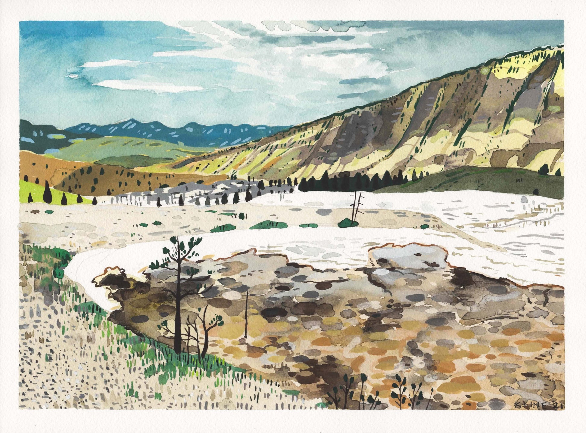 Yellowstone National Park, Mammoth Hot Springs. Watercolor on Paper. 9" x 12"